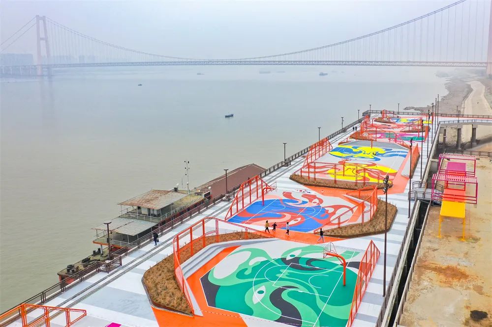 ? ? ? ?除了對原有碼頭元素創新改造,高樁平臺上的活動區域也亮點紛呈:平臺兩端都建設了約兩米寬的玻璃棧道,站在上面,低頭就可以看見滾滾奔流的長江水;面向江心左邊,是全國唯一的國風籃球場,從空中俯瞰,精致的京劇臉譜整齊排列在球場內,為岸線添上一抹色彩。正是通過這種漸進式改造,讓更多城市歷史文化記憶在江灘活起來、傳下去。
