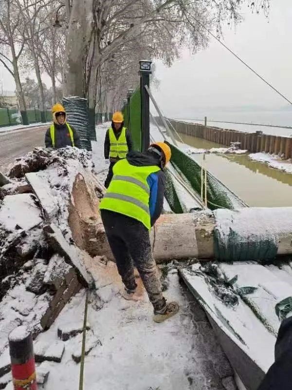? ? ? ?2月4日04時10分,武漢市氣象臺發(fā)布暴雪黃色預(yù)警信號。東湖綠道三期項目位于東湖南路,雙向兩車道,毗鄰東湖,道路臨水、彎多、路窄,一旦結(jié)冰行車時危險性極高。清晨6點(diǎn)半不到,項目部突擊隊員們在武漢大學(xué)凌波門集合,投入到緊張的鏟雪除冰行動。經(jīng)過近6個小時的與雪“共舞”,東湖南路凌波門附近積雪和厚冰被突擊隊一掃而凈。截至5日下午15時,為放鷹臺段人行通道420米、東湖南路3公里掃雪除冰,清理倒伏法桐一棵、沿線因雪壓落樹枝全部清理完畢,道路無結(jié)冰且通行狀態(tài)良好。
